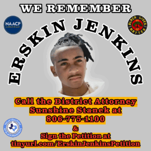 The family of 20-year-old Black Black college sophomore at Texas Tech, Erskin Jenkins has convened a national delegation calling for justice, beginning with a full investigation into his death. The group, which includes the families of #MikeBrownJr (Ferguson), #GlennFosterJr (former New Orleans Saints player killed in Alabama), and #AndrewJosephIII (14-year-old killed by sheriffs’ action in Tampa), is organizing a week of action that includes community engagement and a press conference. Anchoring organizations are Black Lives Matter Grassroots, NAACP Lubbock Branch, and Lubbock Coalition for Black Democrats.