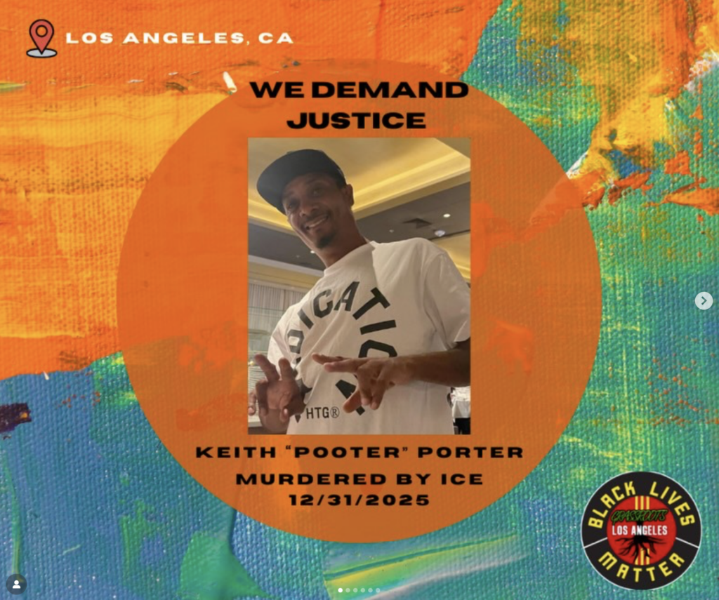 On New Year’s Eve, as the world thirsted for celebration, Black father, son, neighbor, and community member, #KeithPorter stepped outside his front door to celebrate. Like many around the nation, he fired his gun in the air to celebrate the coming of 2026. An ICE agent who lived in the same complex moved as if Keith was no more than a target in a game. He went inside his own unit, put on his tactical gear, grabbed his ICE-issued firearm, stepped back outside, and shot this Black man dead in front of his own home.